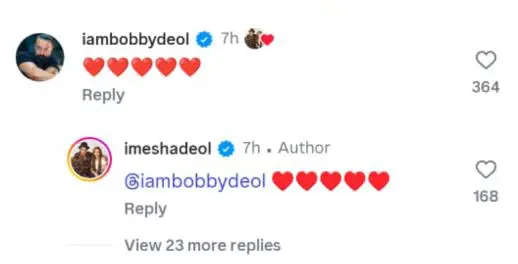 ઈશાની આ ભાવુક પોસ્ટ પર તેના સાવકા ભાઈ બોબી દેઓલે પોતાની પ્રતિક્રિયા આપી હતી. બોબીએ કોમેન્ટ બોક્સમાં હાર્ટ ઈમોજી બનાવીને પોતાનો પ્રેમ વ્યક્ત કર્યો હતો, જેના જવાબમાં ઈશાએ પણ હાર્ટ ઈમોજી મોકલ્યું હતું.