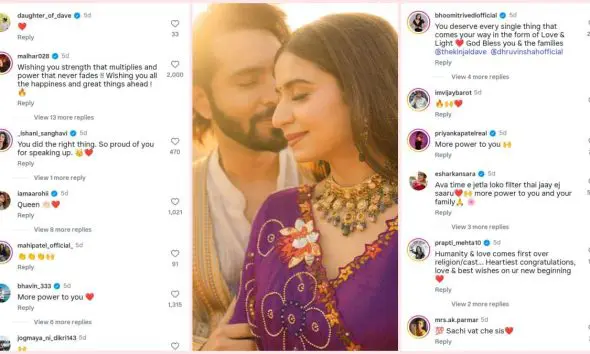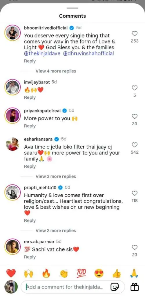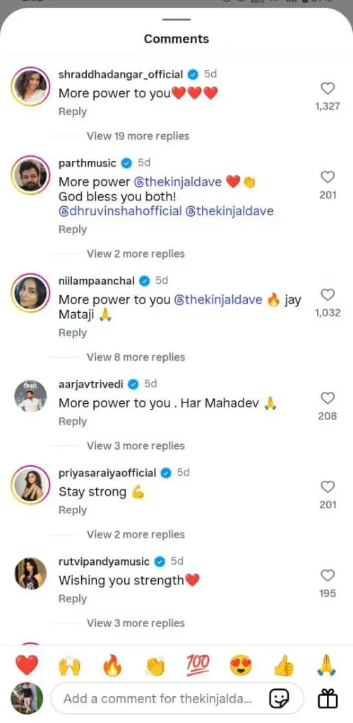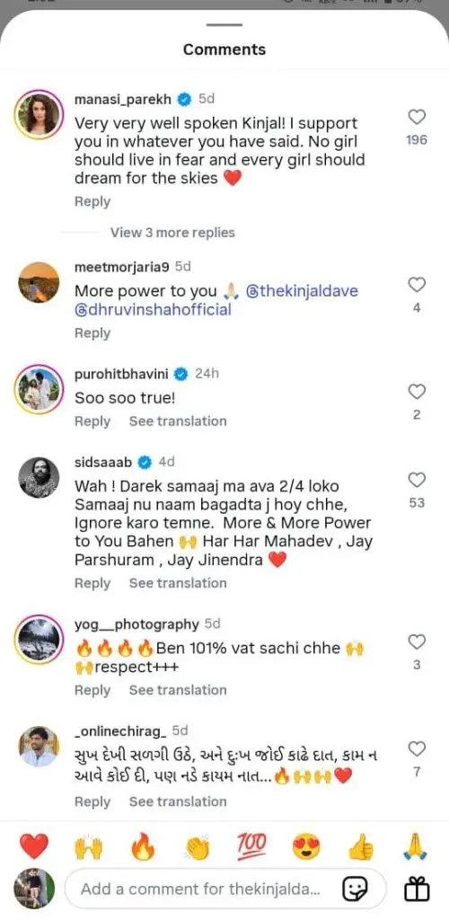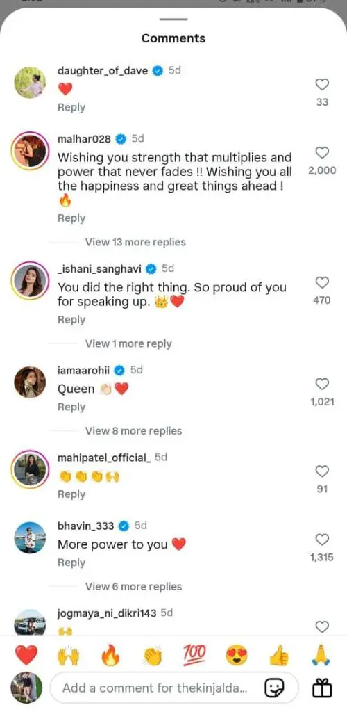 બીજી તરફ, લોકગાયિકા ગીતા રબારીએ પણ કિંજલ સાથેની તસવીર શેર કરીને લખ્યું હતું કે, "બહેન, અમે તારી સાથે છીએ." આ સિવાય પાર્થિવ ગોહિલ, ઇશાની સંઘવી, આરોહી, ભાવીન, નિલમ પંચાલ, આર્જવ ત્રિવેદી, માનસી પારેખ, આરજે સિદ્દ, જીગ્નેશ કવિરાજ, આયુષી ધોળકિયા અને ભક્તિ કુબાવત જેવા કલાકારોએ પણ કિંજલના સમર્થનમાં પોસ્ટ મૂકી છે.