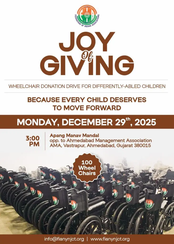 અમેરિકાની સંસ્થા FIA દ્વારા આ કાર્યક્રમ 29 ડિસેમ્બર, સોમવારના રોજ બપોરે 3:00 વાગ્યે આયોજિત કરવામાં આવ્યો છે. આ સખાવતી પહેલ અંતર્ગત અમદાવાદના વસ્ત્રાપુર વિસ્તારમાં આવેલા અપંગ માનવ મંડળ ખાતે ખાસ જરૂરિયાત ધરાવતા બાળકોને વ્હીલચેરનું દાન કરવામાં આવ્યું. આ પ્રસંગે FIA ચેરમેન અંકુર વૈદ્ય અને પ્રેસિડેન્ટ શ્રીકાંત અક્કાપલ્લી ખાસ ઉપસ્થિત રહી બાળકોને પ્રોત્સાહિત કર્યા.
