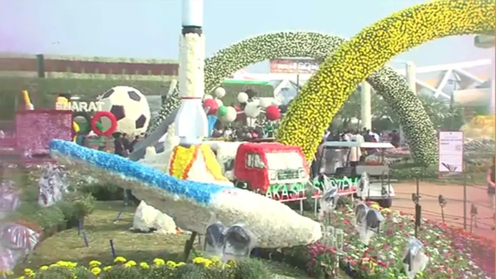 - શાશ્વત ભારત: સમુદ્ર મંથન, ગીતા સાર, ગોવર્ધન લીલા, ગંગા અવતરણ અને રામ સેતુ જેવા પૌરાણિક પ્રસંગોને ફૂલ-શિલ્પો દ્વારા દર્શાવવામાં આવ્યા છે.