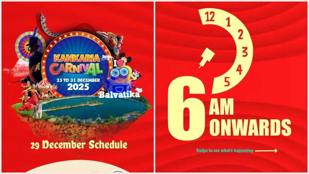 "Amdavad Kankaria Carnival 2025 by AMC under Amdavad festival, schedule for 29th December 2025. Enjoy a day full of cultural performances, workshops and live shows across all stages at Kankaria. Entry is free for all. Visit with family and friends and celebrate together. pic.twitter.com/oBjy2R8B4v