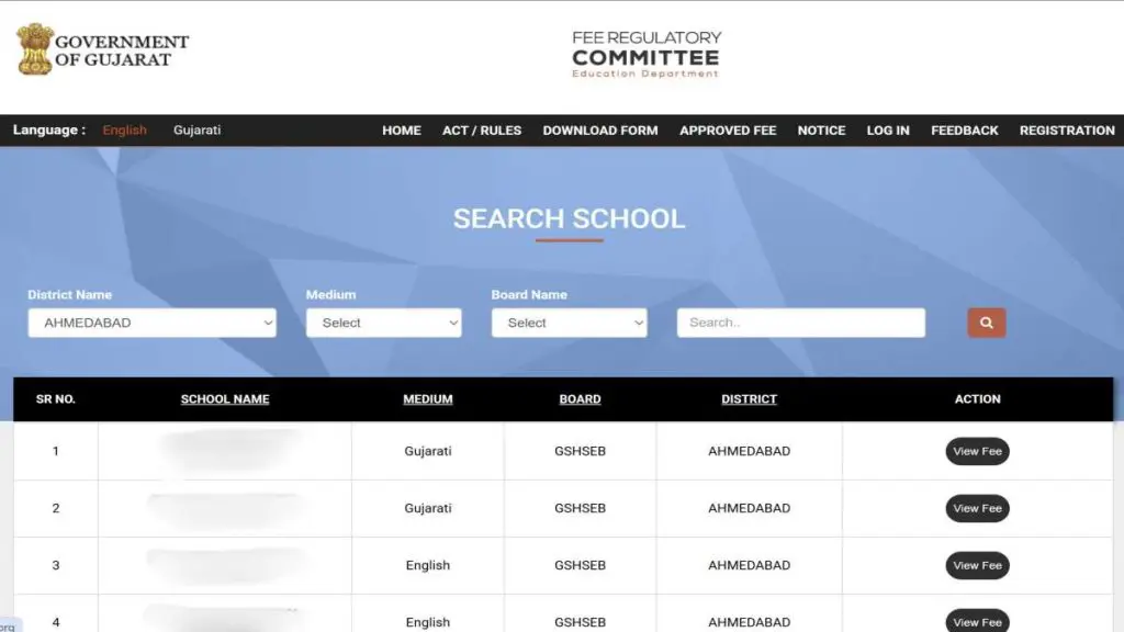 - 4). ઓર્ડર ડાઉનલોડ કરો: શાળાનું નામ દેખાતા તેના પર ક્લિક કરવાથી FRC દ્વારા નક્કી કરેલી ફીનો સત્તાવાર ઓર્ડર (PDF) ખુલશે.