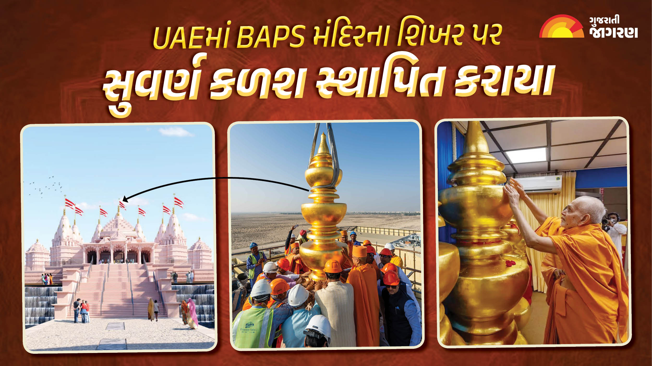 BAPS Hindu Mandir Abu Dhabi (6-12-2023): UAEના આબુ ધાબીમાં બની રહેલાં પહેલા હિન્દુ મંદિરનું કામ ફુલ સ્પીડમાં થઈ રહ્યું છે. થોડાક દિવસ પહેલાં જ અહીં મંદિરના 7 શિખરમાંથી પ્રત્યેક શિખર પર શાસ્ત્રોક્ત વિધિ મુજબ અમૃત કળશનું સ્થાપન કરવામાં આવ્યું છે. આ પ્રસંગે બ્રહ્મવિહારી સ્વામી, સંતો અને હરિભક્તો ઉપસ્થિત રહ્યા હતા. ત્યારે આ કળશની શું વિશેષતા છે અને તેનું મહાત્મ્ય શું છે તે અંગે BAPSના વિવેકજીવન સ્વામીએ ગુજરાતી જાગરણ સાથે વાતચીત કરી રસપ્રદ માહિતી શેર કરી હતી. મહત્વનું છે કે, ગત નવેમ્બર મહિનામાં 11 નવેમ્બરે ગોડંલમાં સ્થિત BAPS મંદિરમાં મહંત સ્વામીએ 7 અમૃત કળશ અને 9 ધ્વજ દંડની પૂજા કરી હતી.