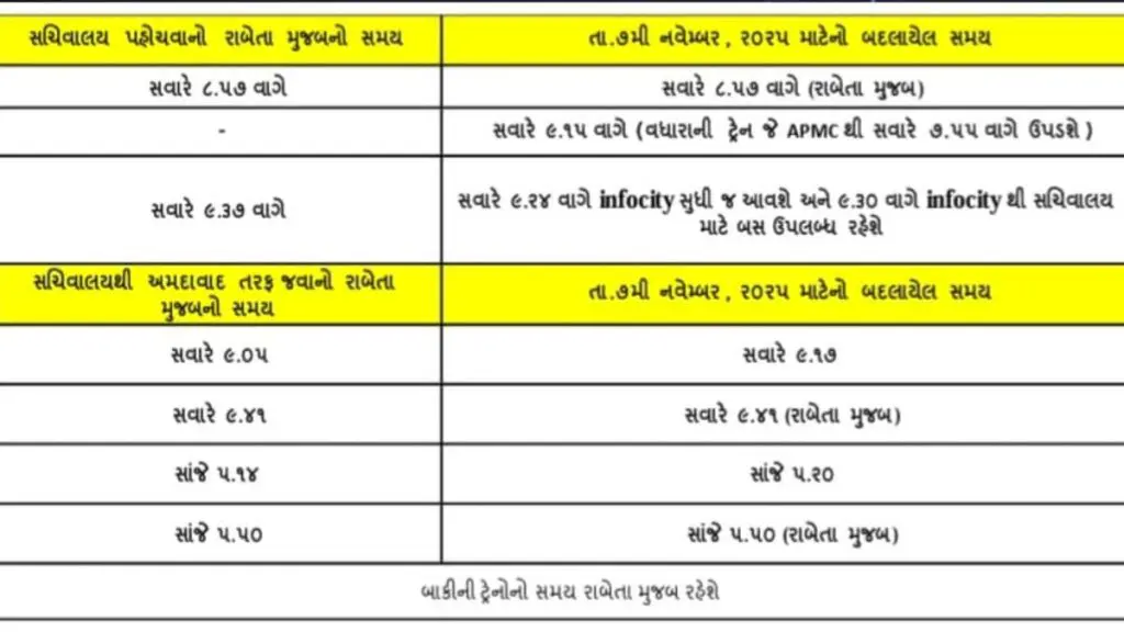| સેક્રેટરીએટ (ગાંધીનગર) તરફ | નિયમિત ટ્રેનો | APMC થી સવારે 7:55 વાગ્યે ઉપડતી વધારાની ટ્રેન | આ ટ્રેન સવારે 9:15 વાગ્યે સેક્રેટરીએટ પહોંચશે. |