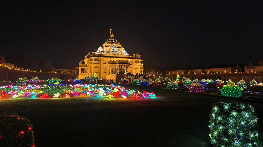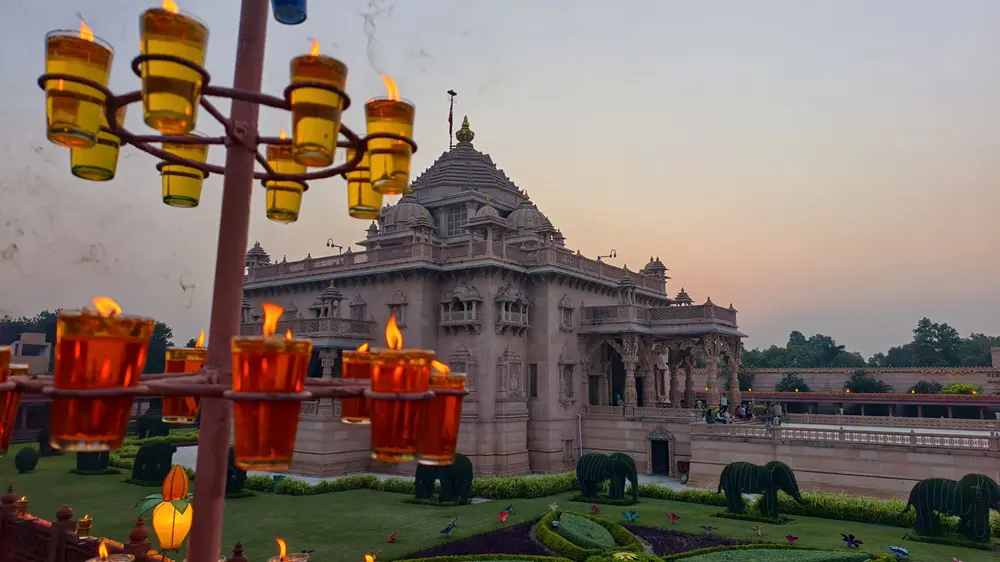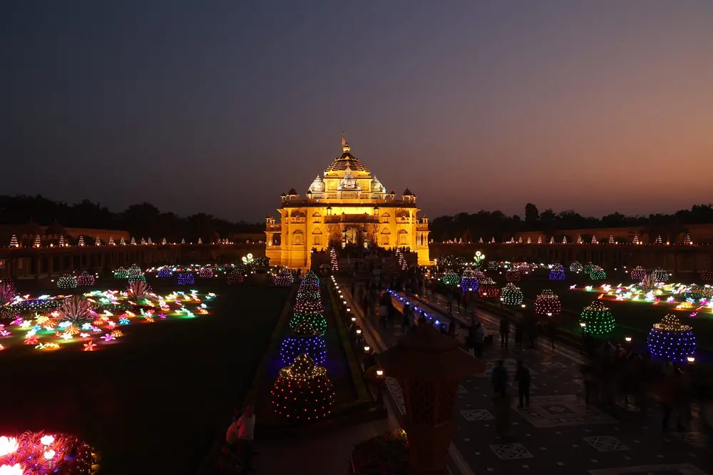 સંધ્યા સમયે હજારો દીવડાઓ વચ્ચે દેદીપ્યમાન અક્ષરધામ મંદિર, હરિયાળા બગીચાઓને પ્રકાશમય બનાવતું ‘ગ્લો ગાર્ડન’, ‘નીલકંઠ વાટિકા’માં નયનરમ્ય રોશની, સંગીત અને 108 ગૌમુખમાંથી વહેતી જલધારા મધ્યે સ્થિત 49 ફૂટ ઊંચી તપોમૂર્તિ શ્રી નીલકંઠ વર્ણીની રમણીય મૂર્તિ આદિ આકર્ષણો દર્શનાર્થીઓને ‘સત્યમ્ – શિવમ્ – સુંદરમ્’ની અનુભૂતિ કરાવે છે.