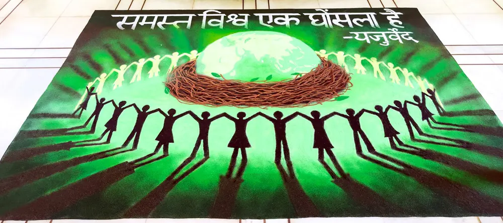 આ વર્ષે એકતા અને વિશ્વબંધુત્વનો સંદેશ આપતા યજુર્વેદના મંત્ર ‘યત્ર વિશ્વં ભવતિ એક નિડમ્ ‘ના મધ્યવર્તી વિચાર સાથે પરંપરાગત શૈલીથી તૈયાર થયેલ આકર્ષક રંગોળી નિહાળવી એ પણ એક સંભારણું બની રહેશે.