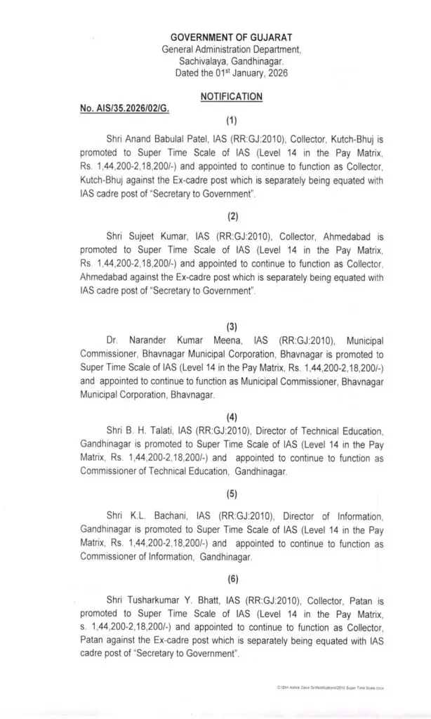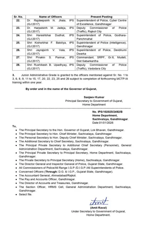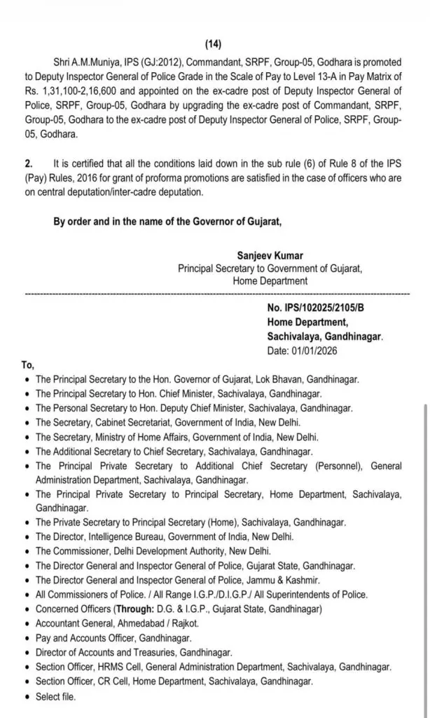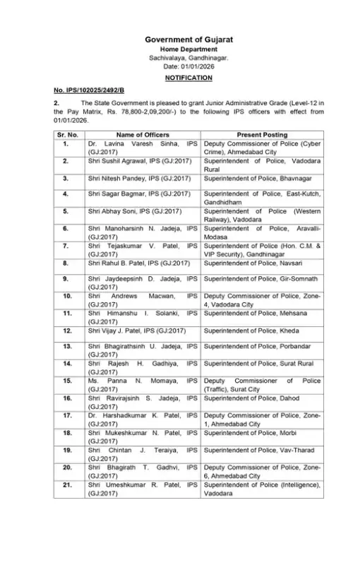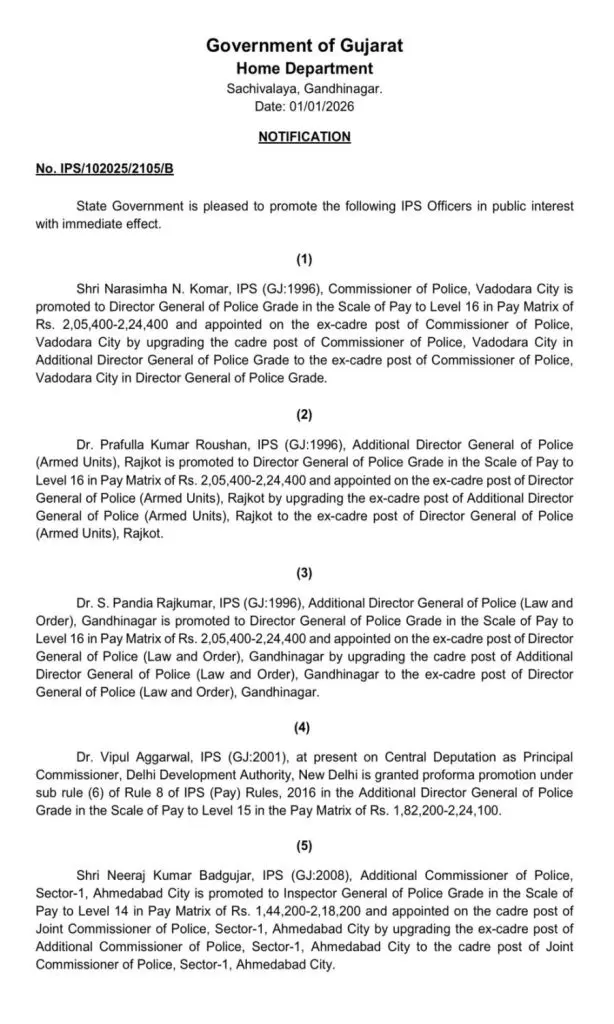 Gandhinagar News: આજથી વર્ષ 2026 નો પ્રારંભ થયો છે. નવું વર્ષ સારું જાય તેવી આશા સાથે લોકોએ પ્રથમ દિવસનો આરંભ કર્યો છે, પરંતુ ગુજરાતના કેટલાક IAS-IPS અધિકારીઓ માટે નવા વર્ષ તો પહેલા દિવસે જ શુભ સાબિત થયો છે. ગુજરાત પોલીસ વિભાગના 14 જેટલા IPS અધિકારીઓને પ્રમોશન આપવામાં આવ્યું છે. આ ઉપરાંત કેટલાક IAS અધિકારીઓને પણ પ્રમોશન આપવામાં આવ્યું, અને કેટલાક અધિકારીઓના ગ્રેડ-પેમાં વધારો કરવામાં આવ્યો છે.