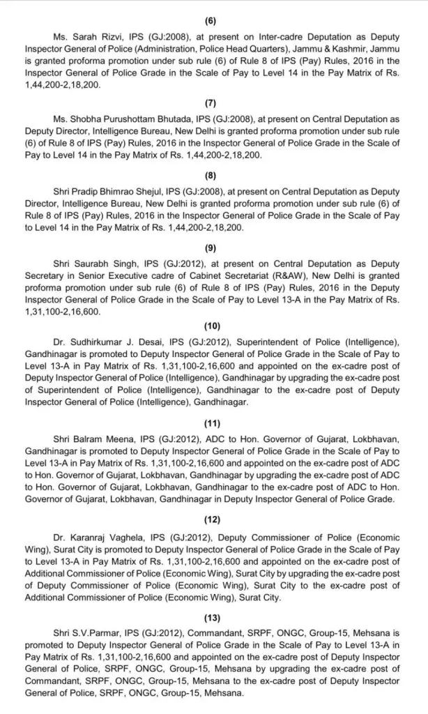 2013ની બેચના 13 IAS અધિકારીઓના ગ્રેડ પેમાં વધારો કરવામાં આવ્યો છે. તેમને હવે લેવલ 13 પે મેટ્રિક્સ મુજબ પગાર તથા અન્ય ભથ્થા ચૂકવાશે. ગુજરાતના નાણા વિભાગમાં પ્રિન્સિપાલ સેક્રેટરી તરીકે કાર્યરત IAS ડૉ. ટી. નટરાજનને ગુજરાત સરકારમાં એડિશનલ ચીફ સેક્રેટરી તરીકે પ્રમોશન આપ્યું છે. ઈન્ડસ્ટ્રીયલ અને માઈન્સ વિભાગમાં પ્રિન્સિપલ સેક્રેટરી IAS મમતા વર્માને એડિશનલ ચીફ સેક્રેટરી તરીકે પ્રમોટ કર્યા છે.