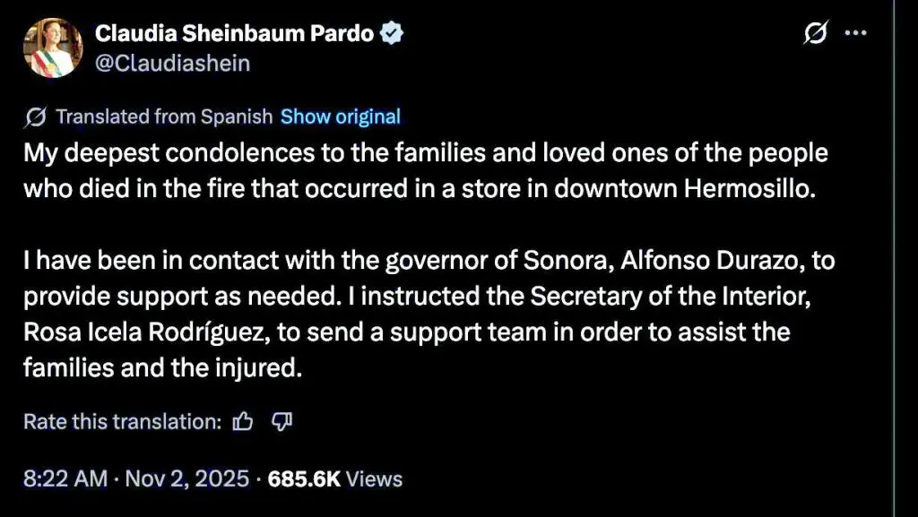 સ્ટેટ એટર્ની જનરલ ગુસ્તાવો સલાસ ચાવેઝે જણાવ્યું હતું કે, પ્રારંભિક તપાસમાં જાણવા મળ્યું છે કે ઝેરી ગેસ શ્વાસમાં લેવાથી મૃત્યુ થયા છે. હાલમાં એવા કોઈ સંકેત નથી કે આગ જાણી જોઈને લગાવવામાં આવી હતી, જોકે શક્યતા નકારી શકાય નહીં. ઘટના બાદ, 12 ઘાયલ લોકોને હર્મોસિલોની છ હોસ્પિટલોમાં દાખલ કરવામાં આવ્યા હતા અને તેઓ સારવાર લઈ રહ્યા છે.