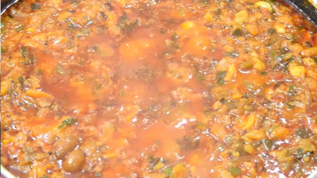 - પછી તેમા સમારેલું કેપ્સિકમ, સમારેલા લીલા મરચા, ટમેટા, લીલી ડુંગળી અને લીલું લસણ સમારી ઉમેરવું. બધુ બરાબર મિક્સ કરી લો પછી 6 મિનિટ પાકવા દો. પછી રસા પ્રમાણે પાણી ઉમેરો. પછી આદુ-લસણની પેસ્ટ ઉમેરો.