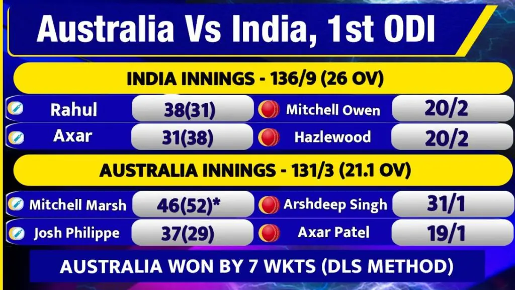 પ્રથમ બેટિંગ કરતા ભારતે 26 ઓવરમાં 136 રન બનાવ્યા. વરસાદને કારણે મેચ 26 ઓવરમાં ઘટાડી દેવામાં આવી. રોહિત શર્મા 14 બોલમાં 8 રન બનાવીને આઉટ થયો, જ્યારે શુભમન ગિલ 18 બોલમાં 10 રન બનાવીને પેવેલિયન પાછો ફર્યો. વિરાટ કોહલી પણ રન બનાવવામાં નિષ્ફળ ગયો. તે મિશેલ સ્ટાર્ક દ્વારા 8 બોલમાં 0 રન બનાવીને આઉટ થયો. અંતે, કેએલ રાહુલે 31 બોલમાં 38 રન બનાવ્યા, જ્યારે અક્ષર પટેલે 38 બોલમાં 31 રન બનાવ્યા.