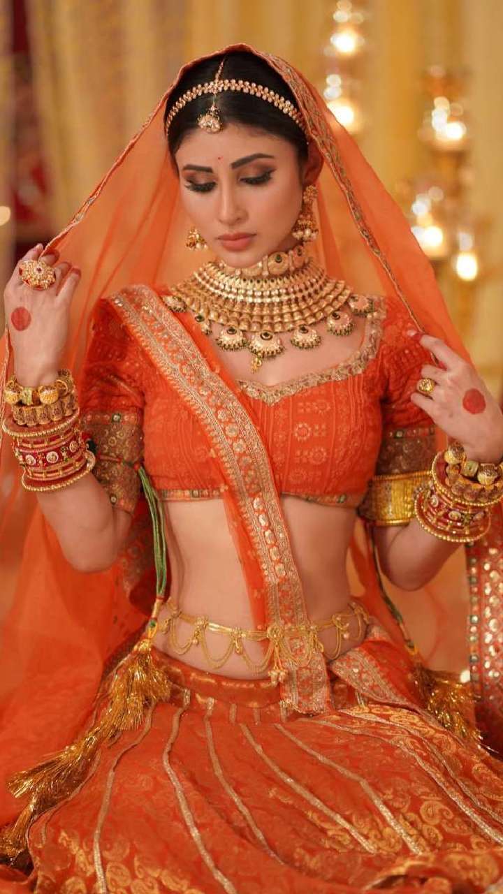 મૌની આ રેડ કલરના લહેંગા વિદ વી નેક ચોળી વિદ માંગ ટીકામાં એકદમ ટ્રેડિશનલ લુક આપી રહી છે