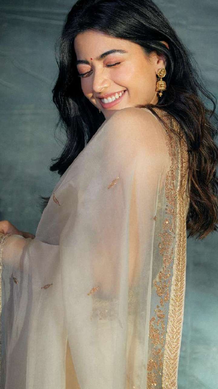 વ્હાઈટ સાડી અને સ્લીવલેસ બ્લાઉઝમાં સ્માઈલ કરતી રશ્મિકાના સાદગીભર્યા અંદાજના ફેન્સ દિવાના છે