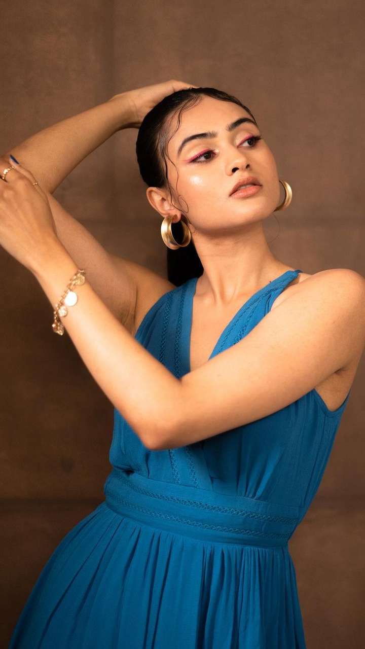 એક્ટ્રેસ જાનકી બોડીવાલા બ્લૂ આઉટફિટમાં હટકે પોઝ આપી રહી છે.