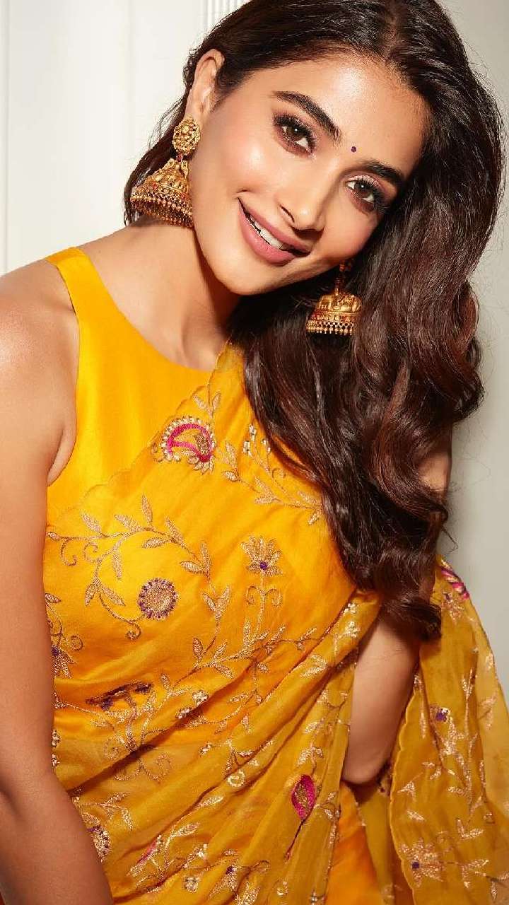 પૂજા હેગડે ગોલ્ડન કલરની સાડીમાં બલાની ખૂબસૂરત લાગી રહી છે