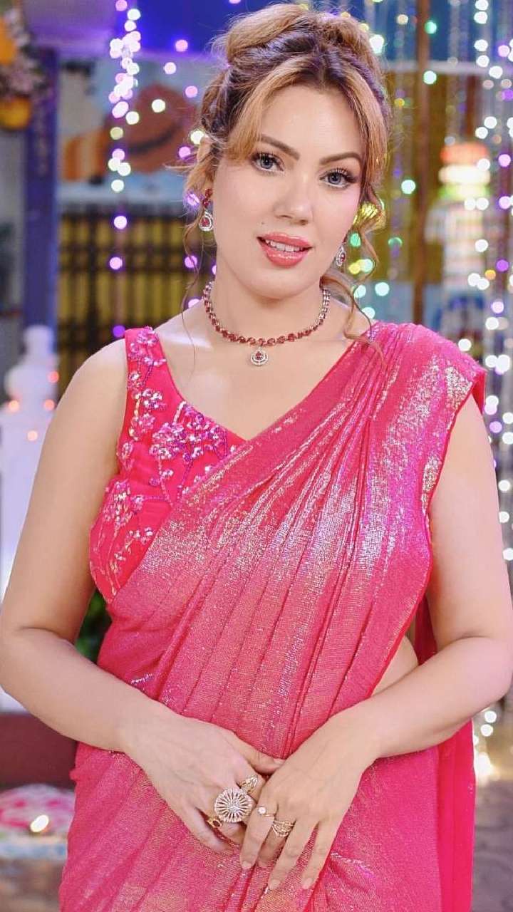 પિંક કલરની સાઇની સાડીમાં મુનમુન દત્તા ખૂબ જ સુંદર લાગે છે. તેમણે આ સાડી સાથે સ્લીવલેસ બ્લાઉઝ પહેર્યો છે. તમે પણ આવા લુકને કોઈ પાર્ટી કે લગ્નમાં અપનાવી શકો છો