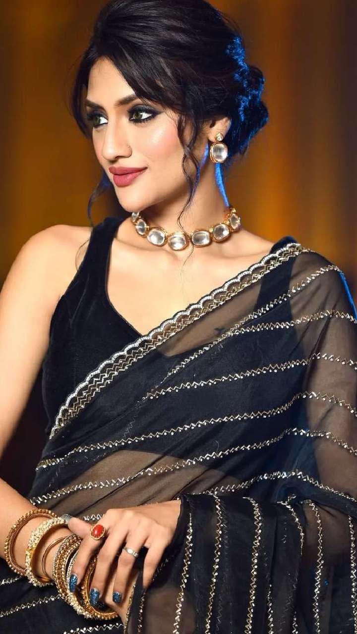 નુસરત આ બ્લેક કલરની સિલ્ક સાડીમાં જલવો વિખેરી રહી છે